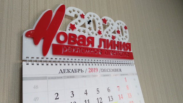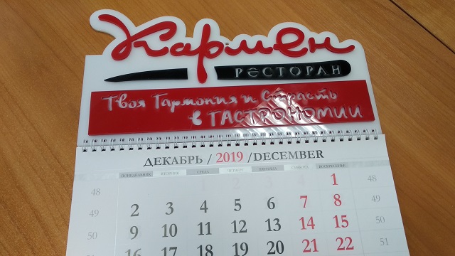 Представляем вашему вниманию новинку в деле казалось бы обычных квартальных календарей! Объемная плашка, выполненная лазерной технологией служит украшением любого интерьера - рабочего или домашнего. Календарная сетка несет как и положено, нужную информацию. Самое интересное заключается в том, что такое исполнение является многоразовым. Если вам понравился календарь, вы можете заказать его обновление на следующий год, сохранив объемный топ. Заказывайте такие календари и узнавайте подробности у наших менеджеров, время есть!