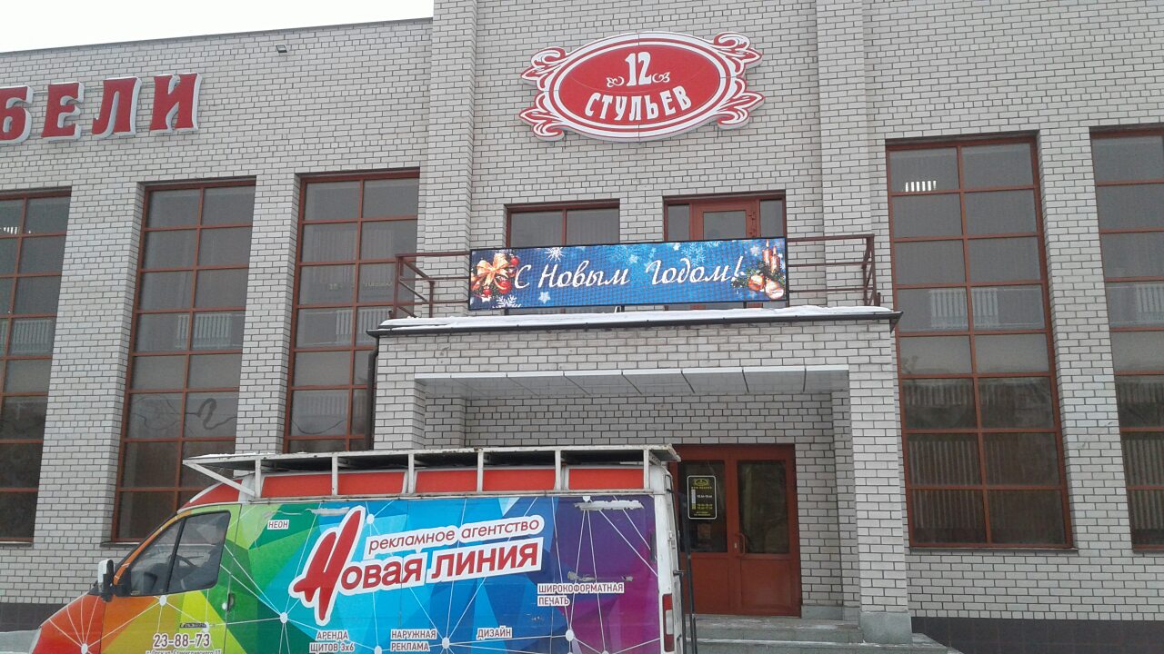 Новость уже давно не новость, но думаем, что рассказать об этом нужно.) В канун Нового 2019 Года, для одного из наших постоянных и любимых клиентов - сеть магазинов отличной мебели 12Стульев, РА Новая Линия изготовила, смонтировала и запустила в эксплуатацию полноцветный светодиодный экран размером 4,2м х 0,8м. Работа довольно сложная, но тем интереснее.